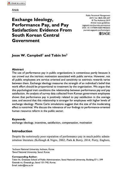 Exchange Ideology, Performance Pay, and Pay Satisfaction: Evidence From South Korean Central Government