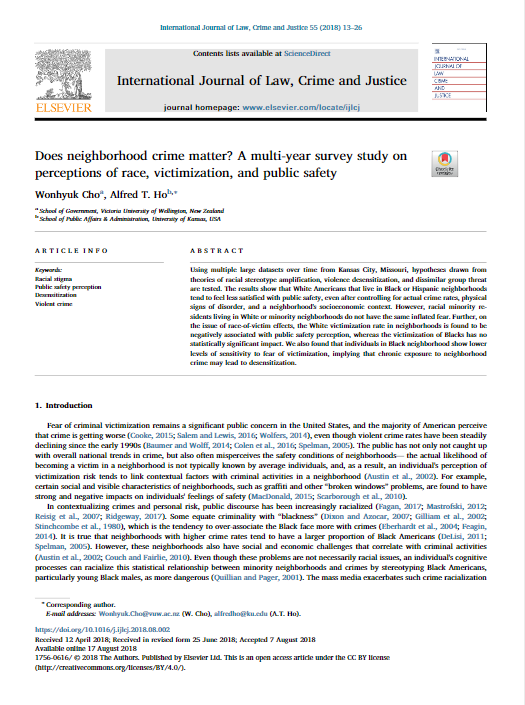 Using multiple large datasets over time from Kansas City, Missouri, hypotheses drawn from theories of racial stereotype amplification, violencedesensitization, and dissimilar group threat are tested. The results show that White Americans that live in Black or Hispanic neighborhoods tend to feel less satisfied with public safety, even after controlling for actual crime rates, physical signs of disorder, and a neighborhood's socioeconomic context. However, racial minority residents living in White or minority neighborhoods do not have the same inflated fear. Further, on the issue of race-of-victim effects, the White victimization rate in neighborhoods is found to be negatively associated with public safety perception, whereas the victimization of Blacks has no statistically significant imp..